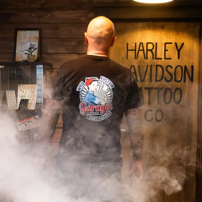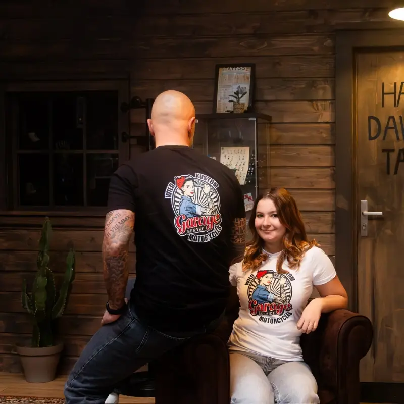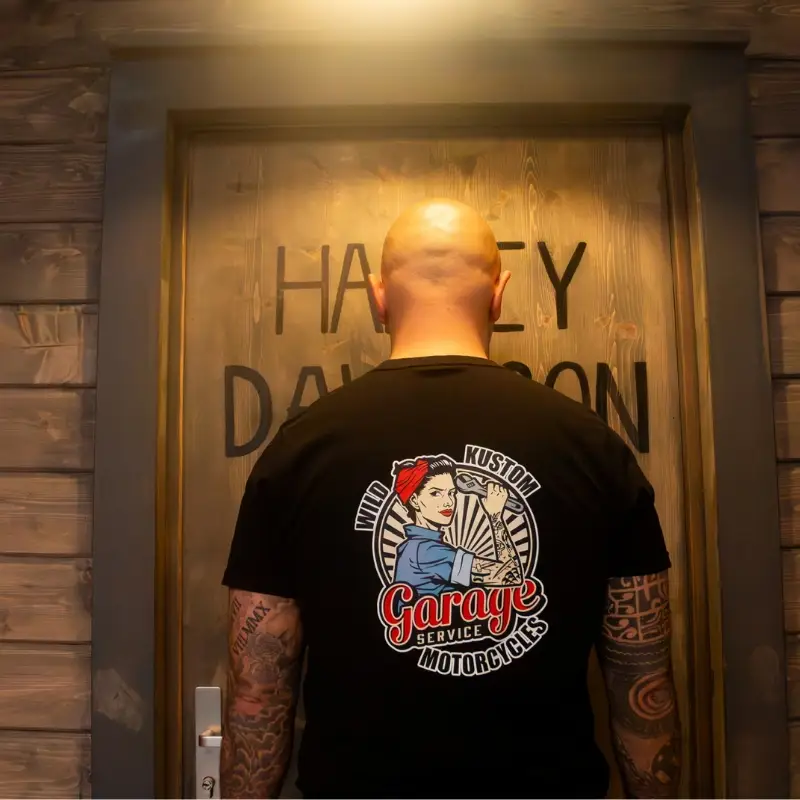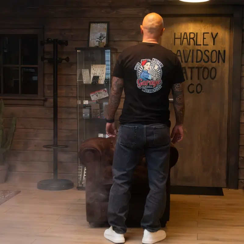 Ce t-shirt noir avec son logo pin-up garage service en couleurs sur le coeur et le dos vous plonge dans l’univers rétro de l’Amérique. Sa coupe regular et son col rond offrent un confort optimal et une silhouette décontractée, parfaite pour le quotidien. Son imprimé en couleur met en avant une pin-up au look de mécanicienne, ce t-shirt ajoute une touche de caractère et de style à vos tenues. Polyvalent, il s’associe facilement avec un jean ou un pantalon pour un look old school et tendance. Un essentiel pour les amateurs de mode vintage à la recherche d’un vêtement confortable et unique.
